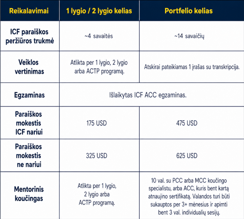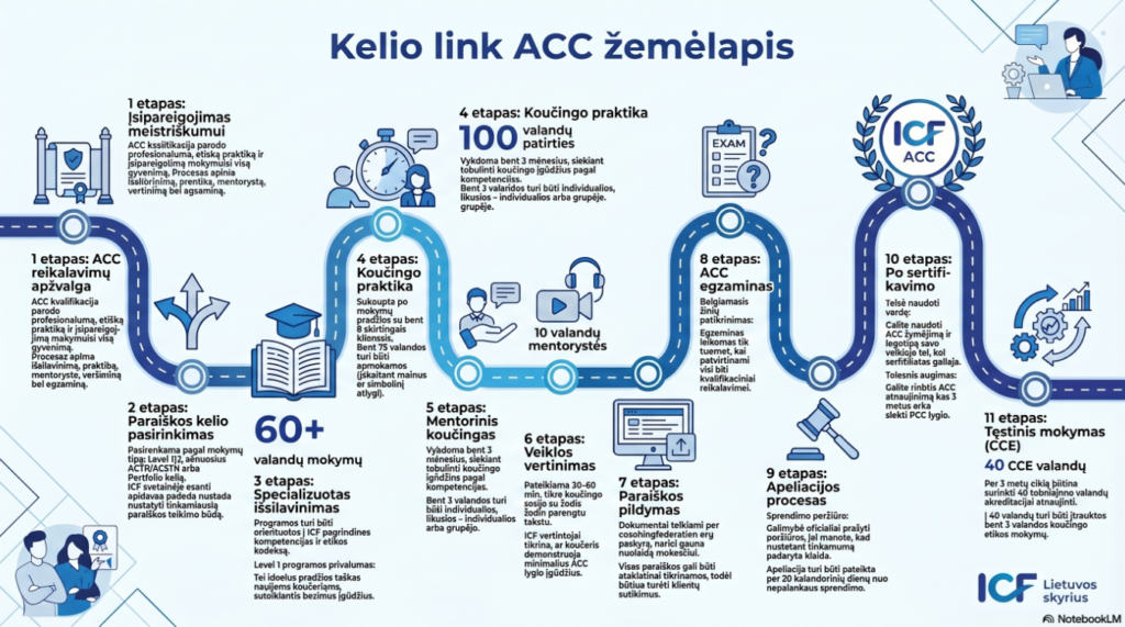 💡 Daugelis specialistų pradeda dirbti link PCC jau ACC kvalifikacijos atnaujinimo laikotarpiu, derindami tęstinį mokymąsi su realia koučingo praktika ir mentoriaus grįžtamuoju ryšiu.